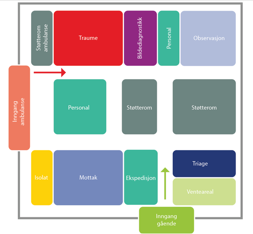 Sykehusbygg anbefaler at akuttmottak prosjekteres med en dobbelkorridorløsning som ivaretar tydelig sonedeling for traume, triage, mottak, observasjon og støttefunksjoner. Løsningen bidrar til økt pasientsikkerhet og effektiv arbeidsflyt, samtidig som den legger til rette for tverrfaglig samhandling, gode kommunikasjonslinjer og høy grad av trygghet for personalet.