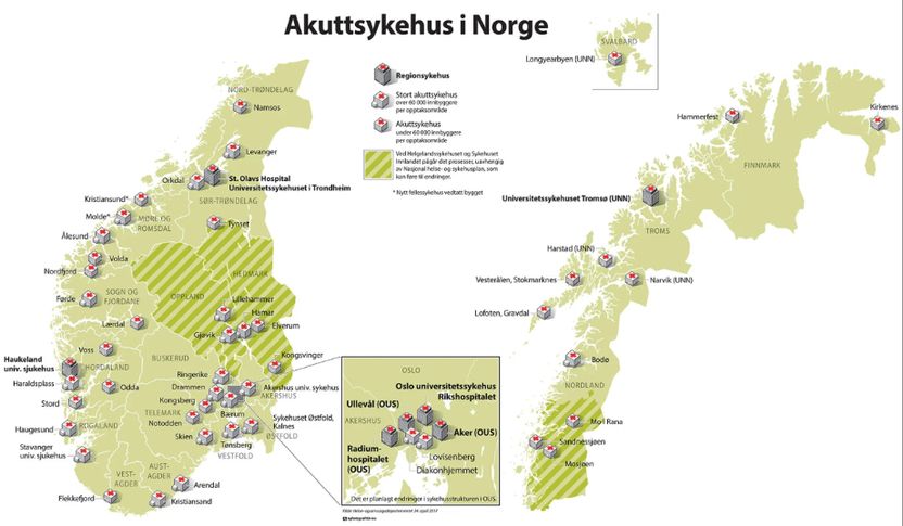 I Norge er det 51 somatiske sykehus med akuttmottak av ulik størrelse. Av disse har 46 sykehus funksjon for akuttkirurgi, og 34 sykehus har traumefunksjon. Et traume defineres som en alvorlig skade på kroppen som følge av ytre påvirkning, for eksempel trafikkulykker, fall, vold eller andre ulykker. Traumepasienter har behov for rask og spesialisert behandling for å sikre liv og begrense varige skader. I tillegg ytes akuttmedisinske tjenester ved enkelte private sykehus samt ved distriktsmedisinske sentre (DMS).